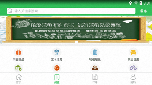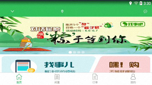 1、打開應(yīng)用首頁,你會看到四個板塊:首頁、閑置、訂單、我的