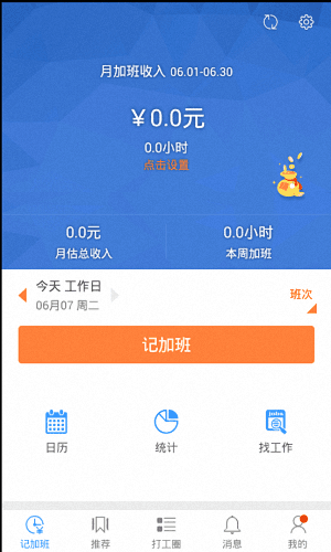 記加班安卓版是一款專為廣大打工者打造的手機辦公軟件,在這里還能邀請好友賺取話費,還能隨時隨地的記錄加班時長,除此之外還為您提供真實的招聘信息,致力于為您打造一個美好的明天。