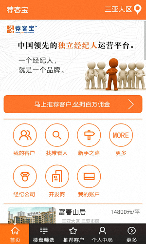 依托于全民營銷的理念,薦客寶幫助全國各地一二手房地產經紀人、酒店旅行社出租車公司的工作人員、小區老業主,以及身邊有客戶資源的任何人,將手中的客戶資源“變廢為寶”,通過推薦客戶購房獲得成交傭金。