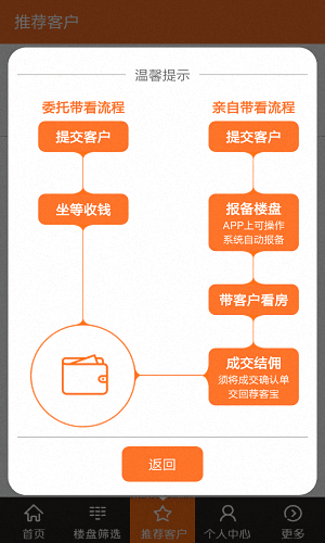 推薦客戶方式非常簡單,只需下載薦客寶APP,提交購房者聯系電話后,即可坐等收錢,所有成交流程在手機端均可以隨時查詢。
