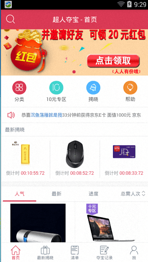 超人奪寶是一款十分火爆的一元搶購商品社區平臺,這里有海量的在線商品,您只需花費一元錢,即有機會獲得各種超值大獎,非常的給力,你所需要的就是運氣而已,這款軟件基于“時時彩”數據源,公平公正公開,你完全有機會獲得海量的一元寶物哦!