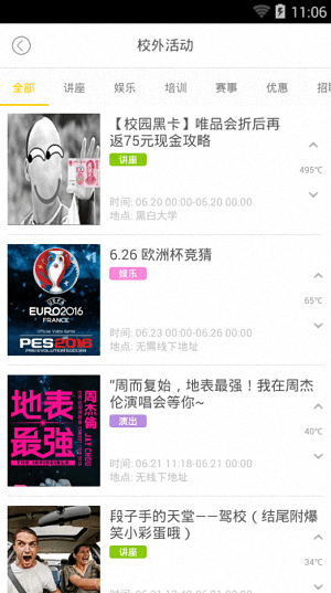 這是一款大學(xué)生的必備神器,能夠提供校內(nèi)外的很多活動(dòng),你可千萬不要再宅在寢室了哦。