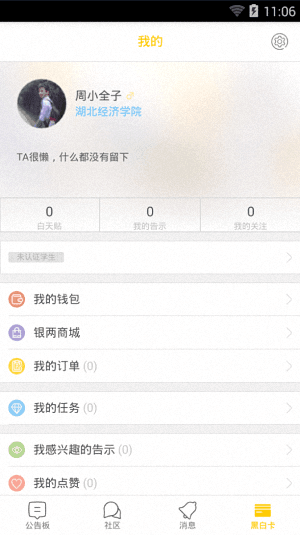黑白校園是一款大學(xué)生必備的手機(jī)社區(qū)應(yīng)用,它能夠?yàn)橛脩魝兲峁┮粋€(gè)給力的大學(xué)社交平臺(tái),你不僅可以在這里發(fā)現(xiàn)身邊的校友,還可以直接在線查找校內(nèi)外的各種給力活動(dòng),有了它,你的大學(xué)生活就不會(huì)再無聊啦。還有其他好玩的功能等著你來看喲。