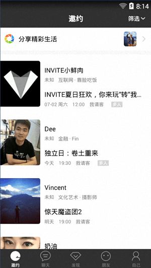 INVITE是一款十分受歡迎的同城社交軟件,它能夠為用戶們提供一個基于生活場景的社交平臺,你可以在這里找到各種不同的線下活動或者線下地點,有不同的人一起去參加各種活動哦,非常的有意思,比起虛擬聊天,線下約起才是王道。