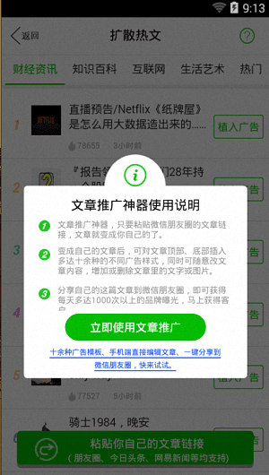 擴散云是一款微商必備的營銷推廣神器,它能夠幫助用戶們輕松在各種朋友圈文章和熱門社區資訊中植入自己的各種廣告,十分的強大,只要有人閱讀,你的廣告就會被看到,甚至還能被一同轉載,它真正能夠將營銷做到好,真正是廣大中小企業的必備營銷神器。