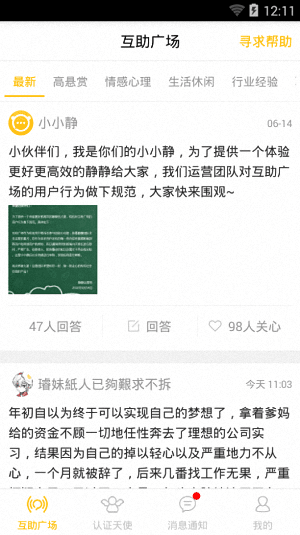 1、廣場。你可以看到很多的求助信息,與大家進行交流