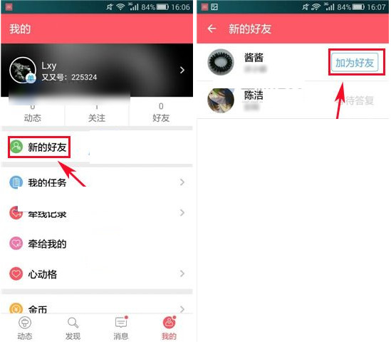 進入個人頁面后點擊【新的好友】。系統自動掃描注冊了又又的的好友,選擇你要添加的好友,點擊【添加】等待同意即可。