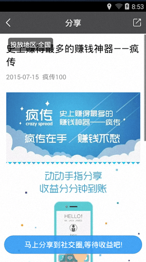 瘋傳,是一款社會化自媒體分享廣告平臺軟件,只要你有微信賬號就能夠通過簡單的分享獲取收益!