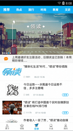 領讀是一款十分優秀的社區應用,它能夠廣大文學作者提供一個交流平臺,用戶們可以隨意在線分享自己的佳作,它還能夠對用戶進行有效的扶持,這里還有很多的線上活動,用戶們可以直接參與各種競猜,贏大獎哦。