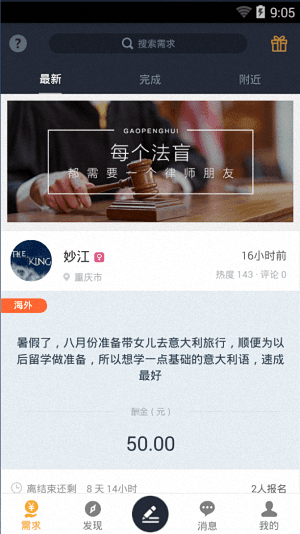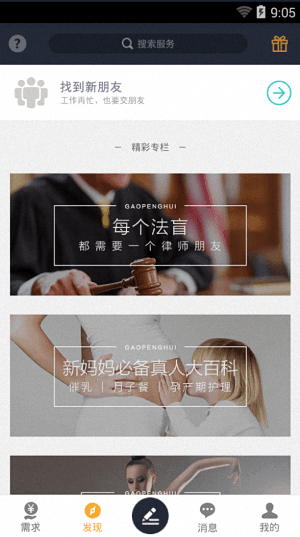 高朋匯是一款很不錯的真人問答交流平臺,它能夠為廣大用戶們提供完美的真人實時答疑服務,只要你有任何需求,就可以直接在線發布,或者你有什么呢專業技能,也可以直接在線接單,它真正讓天下沒有難辦的事情,幾乎是廣大用戶們的必備軟件之一。