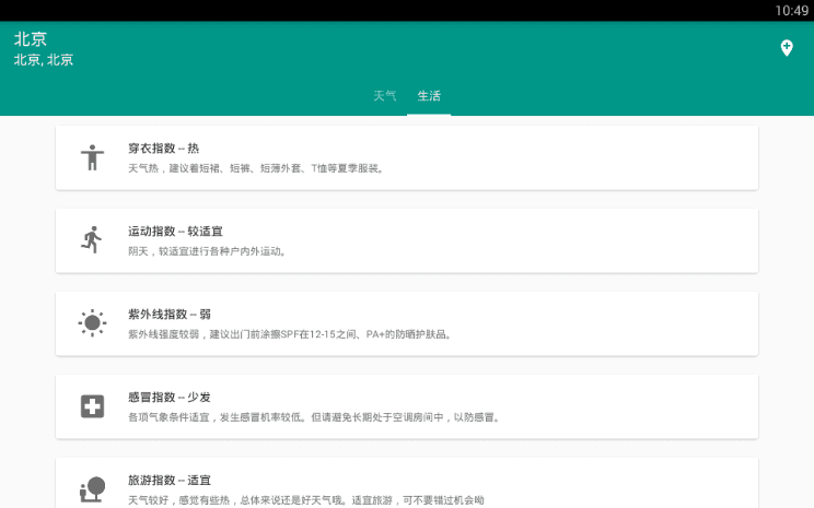 支持穿衣、紫外線、感冒、旅游以及運動等相關指數的參考;