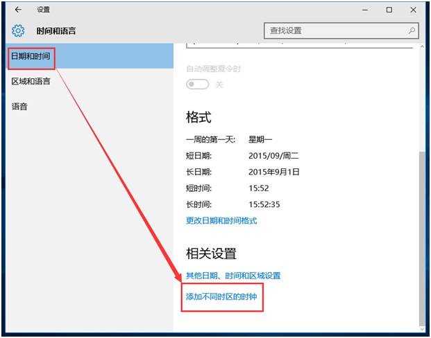 2、在日期和時間設置頁面,點擊“相關設置”中的“添加不同時區的時鐘”