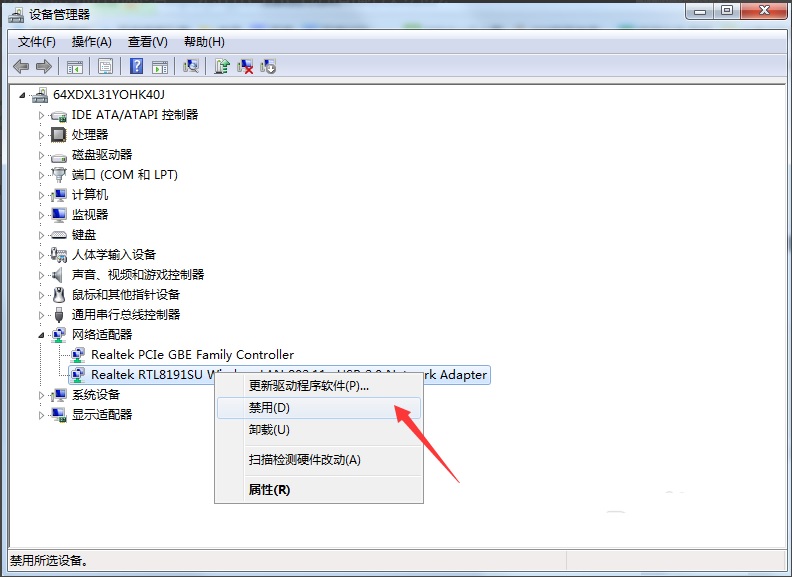 4、點擊展開“網絡適配器”:打開網卡驅動列表,找到我們的當前使用的網卡驅動點擊右鍵,在彈出菜單中選擇“禁用”,然后再點擊“啟用”。