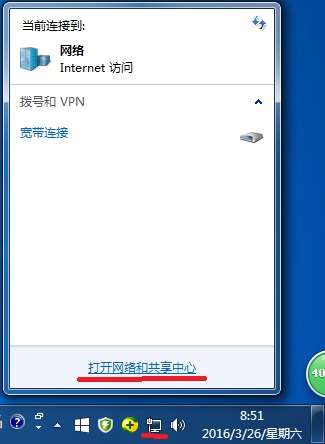 也可在電腦右下角點擊網絡連接圖標,在彈出菜單中選擇“打開網絡和共享中心”進入網絡屬性主界面: