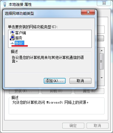 5、在彈出的選擇網絡功能類型對話框內,選擇協議選項,點擊下方的添加按鈕進行添加。