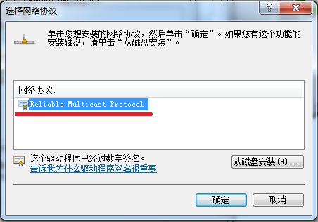 6、點擊添加之后,在彈出的網絡協議對話框內選擇,ReliableMulticast Protocol協議,然后點擊確定即可。