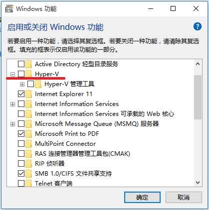 4、在打開的“windows功能”的窗口中找到并勾選“Hyper-v”點擊“確定”按鈕: