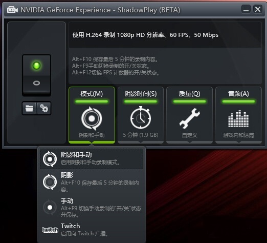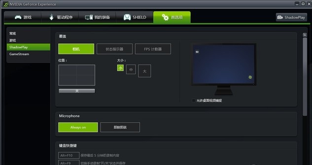 1、打開NVIDIA Geforce experience軟件-點擊右上角的“ShadowPlay”就會進入如下界面