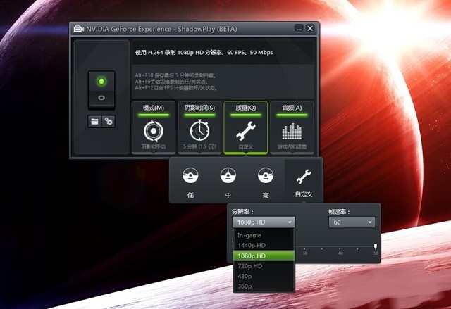 3、接著就是視頻錄制的畫質選擇,分為低、中、高和自定義,小編建議選擇自定義,在自定義中,我們可以自己選擇分辨率、碼率和比特率,從360p到1440p,甚至到與游戲全屏同大小的也可以選擇。