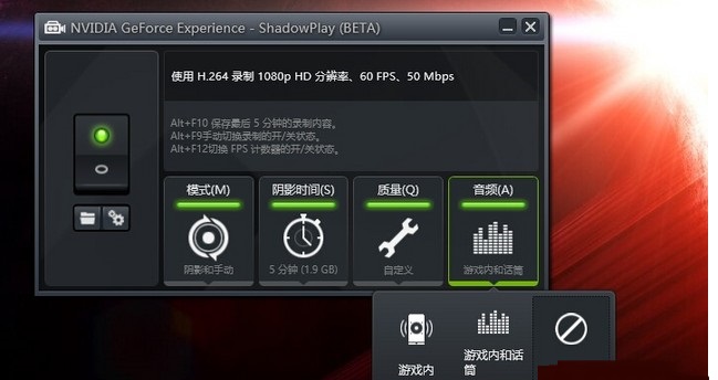 4、后音頻設置部分,推薦使用“游戲內和話筒”可以同時錄到游戲背景音和麥克風說話的聲音,很適用解說游戲視頻。