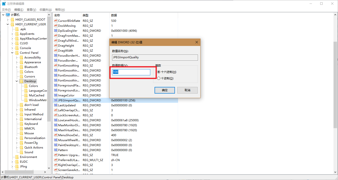 3、新建一個名為 JPEGImportQuality 的 DWORD (32 位)值,并將其值設置為 100 即可。