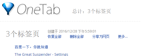 onetab和The Great Suspender都是其中非常出名的一種,原理都是將我們不常用的網頁一次快速回收,避免資源占用,在我們需要時候的時候,隨意一點就可以快速的恢復