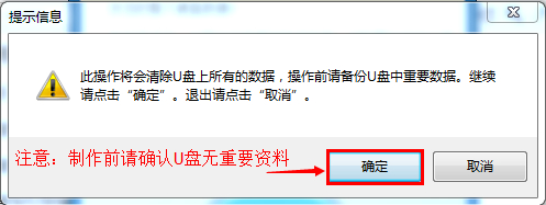 4、制作過程中會(huì)彈出提示信息,需要清除U盤數(shù)據(jù),請確定備份數(shù)據(jù)或U盤中無重要數(shù)據(jù)后點(diǎn)擊【確定】繼續(xù)制作。