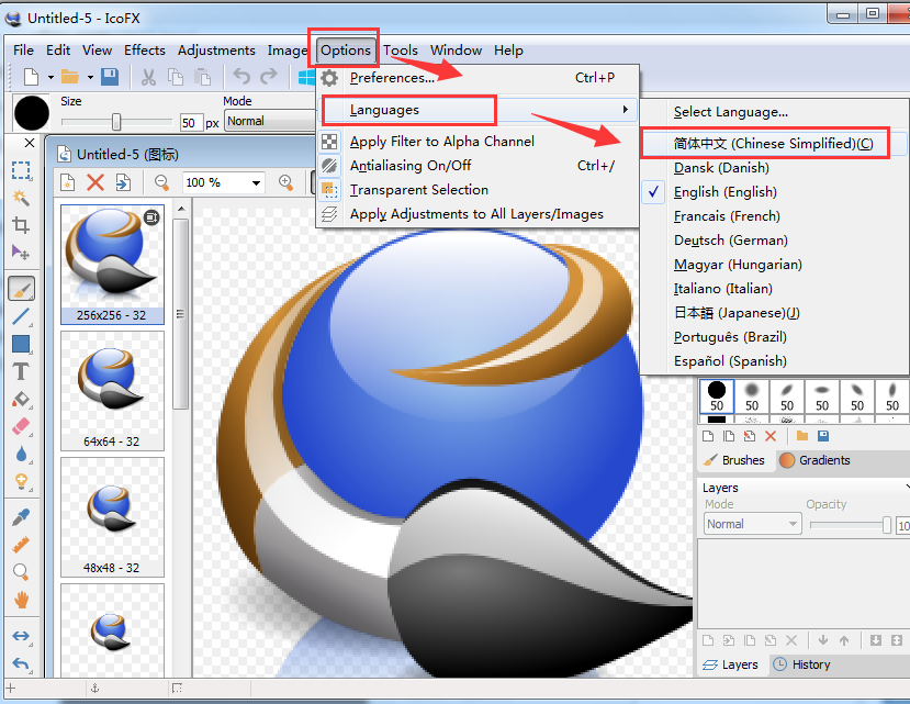 IcoFX下載安裝完成后,進入IcoFX軟件界面中,安裝下圖中的箭頭指示操作,點擊完成后稍得片刻后會自動轉換成中文簡體語音顯示。