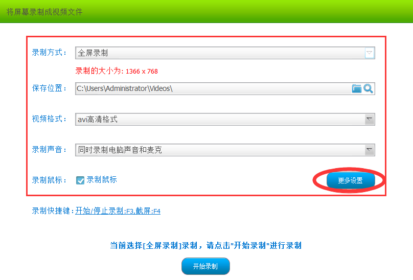 2、點擊“屏幕錄制”,進入屏幕錄制設置界面,在界面中設置各種需要,更多設置中包含攝像頭等設置,可根據錄制需要進行特殊設置。