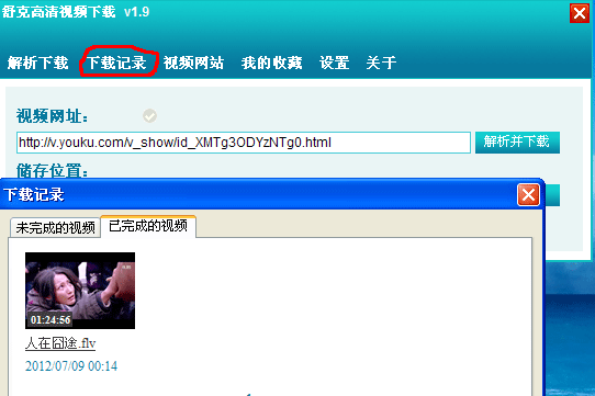 第三步:下載完后,點擊軟件的"下載記錄"按扭,就可以看到剛下載完成的視頻,并且可以利用自帶的播放器播放視頻。