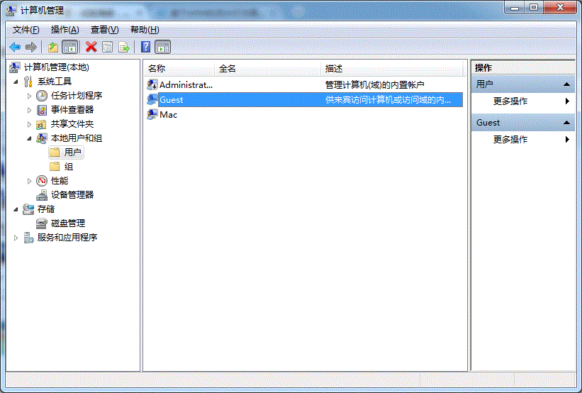 2. 在彈出的【計算機管理】窗口中找到【Guest】用戶,如下圖所示: