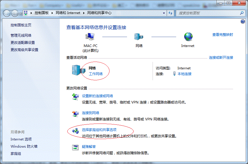 2. 記住所處的網絡類型(筆者的是工作網絡),接著在彈出中窗口中單擊【選擇家庭組和共享選項】,如下圖: