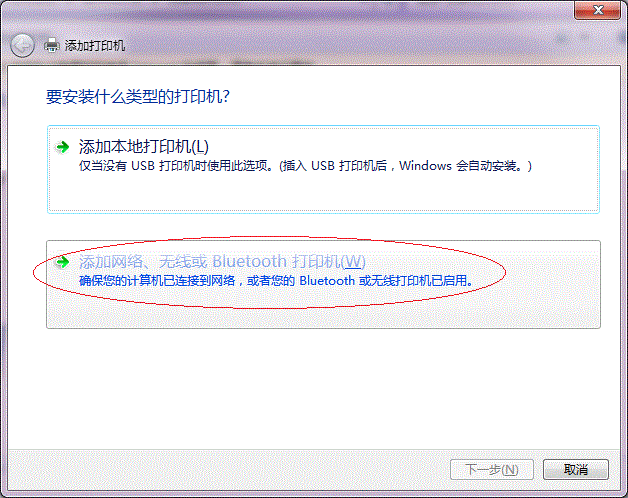 接下來,選擇【添加網絡、無線或Bluetooth打印機】,點擊【下一步】,如下圖: