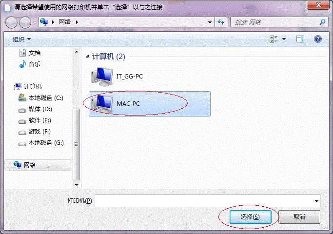 2. 找到連接著打印機的計算機,點擊【選擇】,如下圖:
