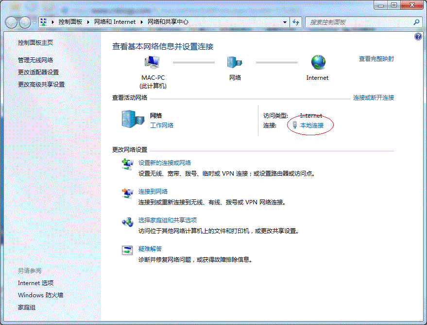 1.2 在【網絡和共享中心】找到【本地連接】,單擊,如下圖: