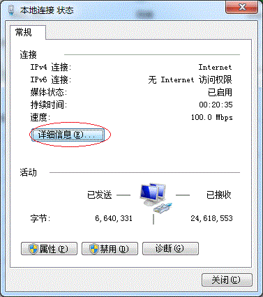 1.3 在彈出的【本地連接 狀態】窗口中點擊【詳細信息】,如下圖: