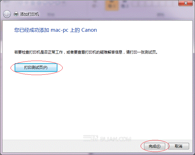 4. 至此,打印機已添加完畢,如有需要用戶可點擊【打印測試頁】,測試一下打機是否能正常工作,也可以直接點擊【完成】退出此窗口,如下圖: