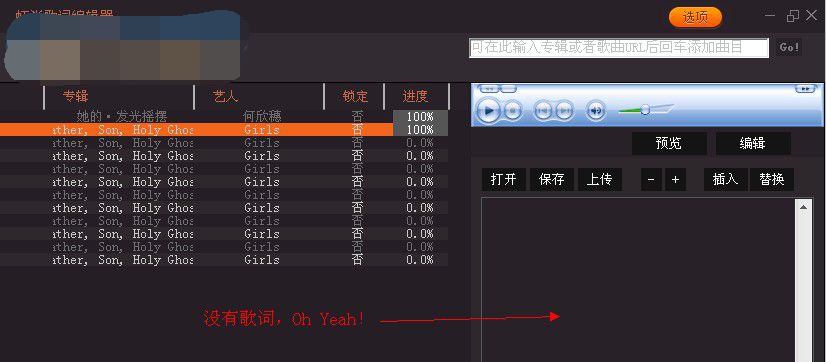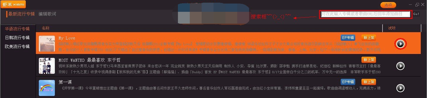 <在框中輸入專輯或歌曲列表,回車鍵添加到列表