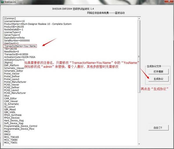 8、在彈出的界面中點擊“打開模板”,加載“license.ini”文件。
