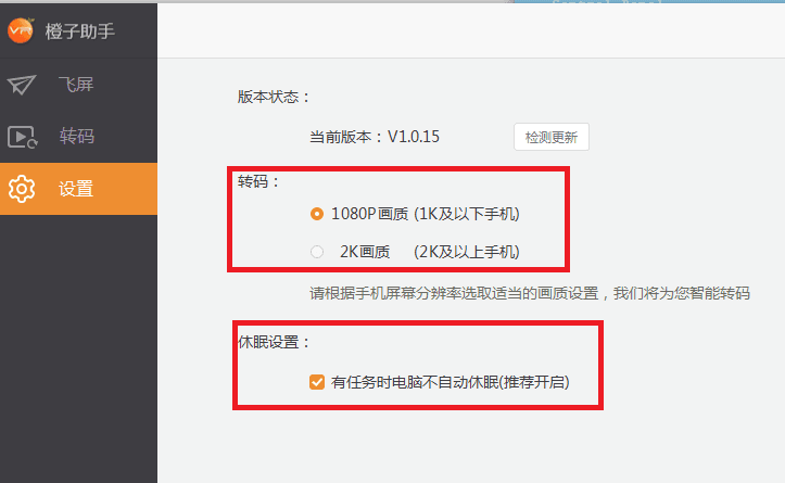 2、進入“設置”界面,自定義轉碼畫質和休眠設置‘