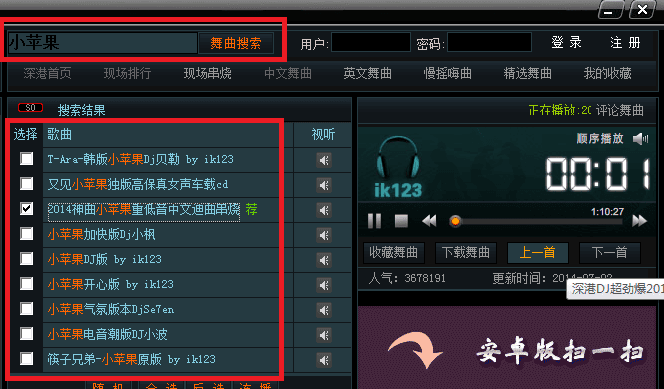 深港DJ音樂盒是一款功能豐富、界面簡潔的DJ音樂在線播放軟件,包括各種風(fēng)格的DJ舞曲,例如慢搖嗨曲、英文舞曲、中文舞曲、現(xiàn)場串燒等等,操作簡單,用戶可以自定義搜索自己感興趣的舞曲進(jìn)行下載播放。