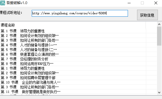英盛網全站視頻破解下載器是一款專門針對英盛網而設計的軟件,它可以幫助你獲取該網站所有視頻資源的下載地址,讓你輕松免費的下載視頻資源。軟件體積小巧,界面簡潔,操作十分簡單。你需要輸入地址,然后點擊獲取信息即可。