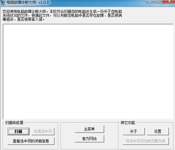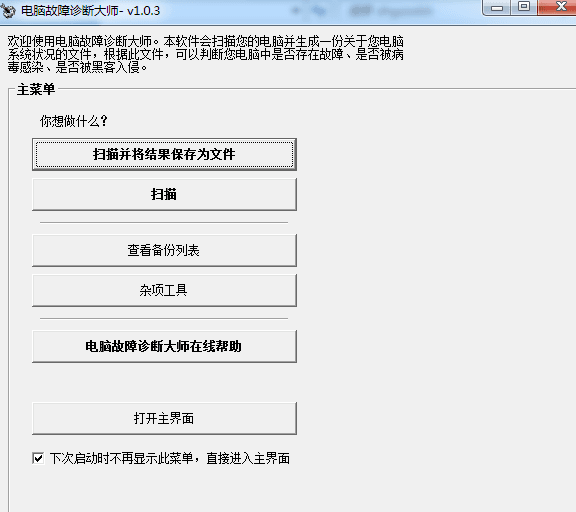 電腦故障診斷大師是一款非常簡單的電腦故障檢測程序, 軟件綠色小巧,主菜單界面十分簡潔,只有掃描、查看備份列表、雜項工具幾個菜單,你可以通過點擊打開主界面按鈕進入主界面,掃描電腦,然后修復選中的項目。