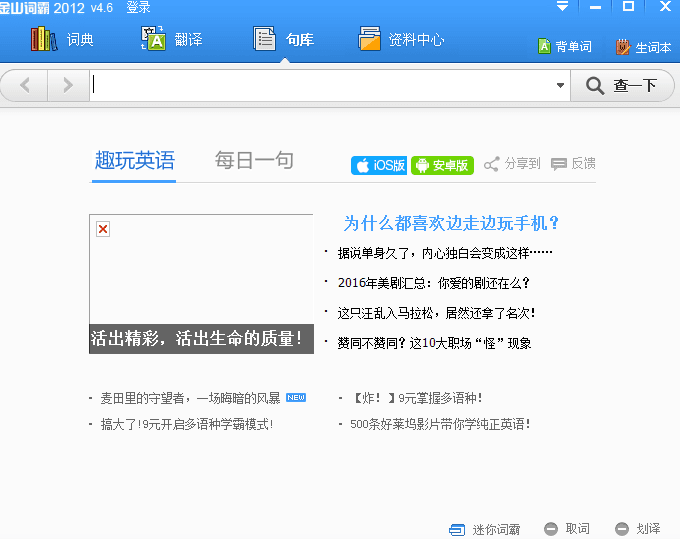 金山詞霸2012是一個功能十分豐富的英語學習輔助工具,不僅可以讓你快捷的查詞,還提供一系列的英語學習功能,比如文章翻譯,背單詞,英文閱讀等。軟件使用簡單,下載后自定義功能安裝即可,方便實用。