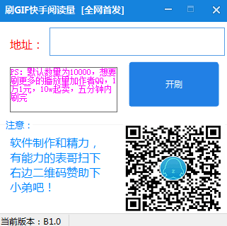 刷GIF快手閱讀量軟件是一款非常實(shí)用的快手刷閱讀量工具,軟件可以幫你迅速刷贊,讓你的快手視頻被更多的人觀看。軟件綠色小巧,界面簡潔直觀,使用非常方便,只需要將快手視頻地址復(fù)制到軟件中,然后點(diǎn)擊開刷按鈕即可。