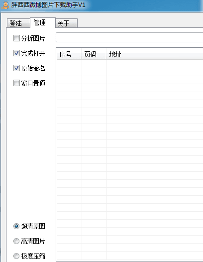 胖西西微博圖片下載助手是一款非常實用的微博圖片下載工具,專門為喜歡玩微博的用戶設(shè)計,可以幫助你輕松下載微博圖片。本款軟件共有登錄、管理、關(guān)于三個菜單,使用簡單,首先登錄微博賬號,在管理菜單中輸入圖片鏈接,分析完就可以下載了。