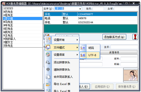 保存到計算機上的文件的編碼格式,可以用明碼或者UTF-8編碼(傳送到手機必須使用的模式)。程序啟動時,文件模式永遠設置為UTF-8編碼模式,如果要在計算機上通過別的程序處理通訊錄文件,可以設置為明碼模式,這樣就可以用文本編輯器處理了。