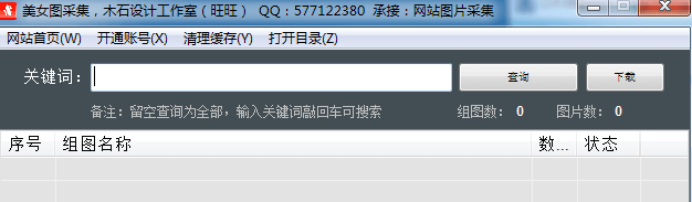 美女圖采集是一個(gè)簡(jiǎn)單易用的圖片采集下載工具,界面簡(jiǎn)潔友好,操作非常方便。具有網(wǎng)站首頁(yè)、開通賬號(hào)、清理緩存等菜單,登錄賬號(hào)后,輸入關(guān)鍵詞即可查詢圖片,然后挑選需要的進(jìn)行下載即可,可操作性強(qiáng)。