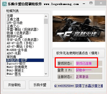 樂購卡盟cf刷槍軟件是一款專門針對穿越火線游戲而研發的輔助軟件,能夠幫助游戲玩家輕松刷取游戲裝備,包括黃金武器、絕版武器以及永久道具等等,還能夠刷去各種頂級槍,不需要花費任何費用,即可享受多游戲裝備體驗。