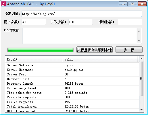 網(wǎng)站Apache ab測試工具是一款專門用來測試網(wǎng)站性能的實用工具,通過本軟件,輕松測出不同類型網(wǎng)站的性能是否良好,同時還支持將測試結(jié)果保存到本地,方便隨時查看,操作簡單,只需要輸入網(wǎng)站地址,軟件自定義請求次數(shù),然后點擊“執(zhí)行”按鈕即可。
